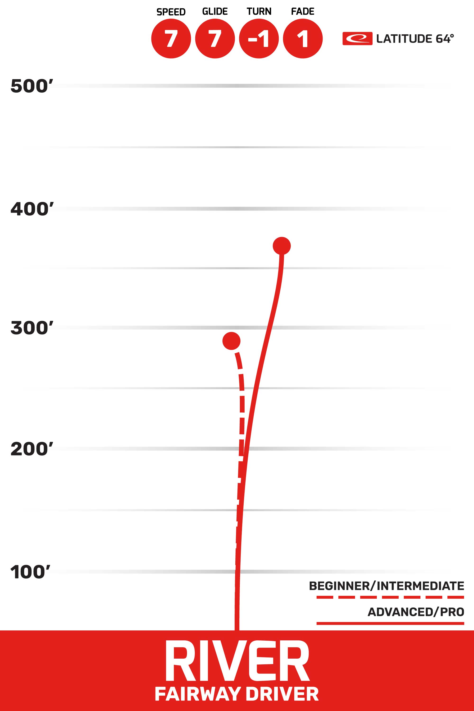 Latitude 64 River ma niesamowicie prostą trajektorie lotu. Flip świetnie równoważy fade co sprawia, że River płynie dłużej niż inne dyski. Z prędkością 7 i turnem -1, jest to bardzo plastyczny dysk o charakterystyce stable/understable, co sprawia, że jest idealny do długich ale nadal precyzyjnych rzutów. Jego stosunkowo niski fade (1) sprawia, że lądowanie jest stabilne, a kontrola nad odległością jest łatwa do uzyskania. Jest to doskonały wybór dla graczy, którzy potrzebują większego dystansu, ale z zachowaniem kontroli nad torem lotu. Latitude 64 River sprawdza się zarówno w warunkach wietrznych, jak i w mniej wymagających sytuacjach, zapewniając stabilność podczas długich rzutów.